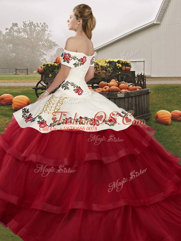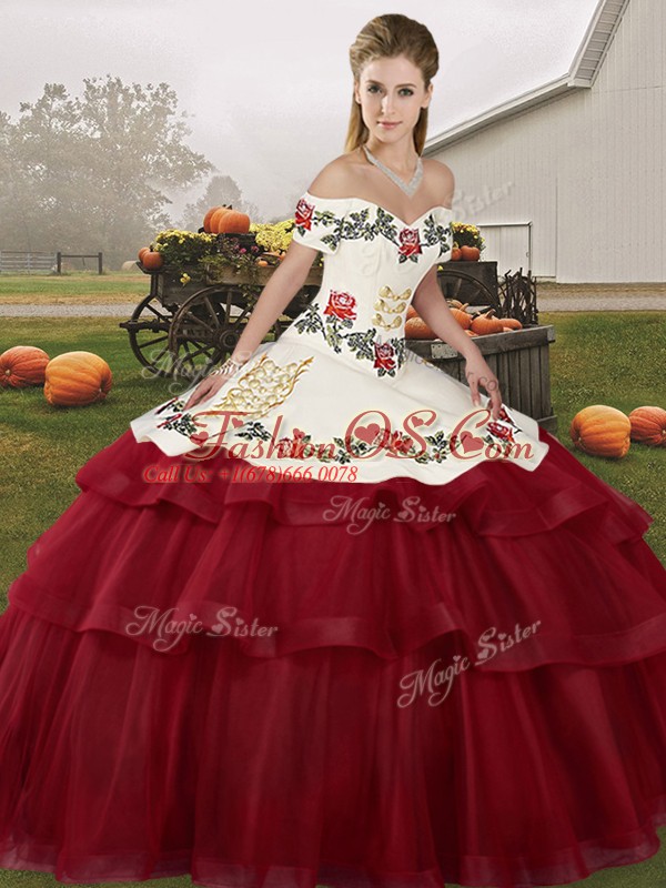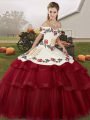 Romantic Embroidery and Ruffled Layers Quince Ball Gowns Wine Red Lace Up Sleeveless Brush Train
