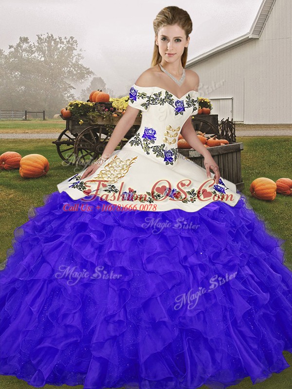 Romantic Floor Length Lace Up Ball Gown Prom Dress Blue for Military Ball and Sweet 16 and Quinceanera with Embroidery and Ruffles