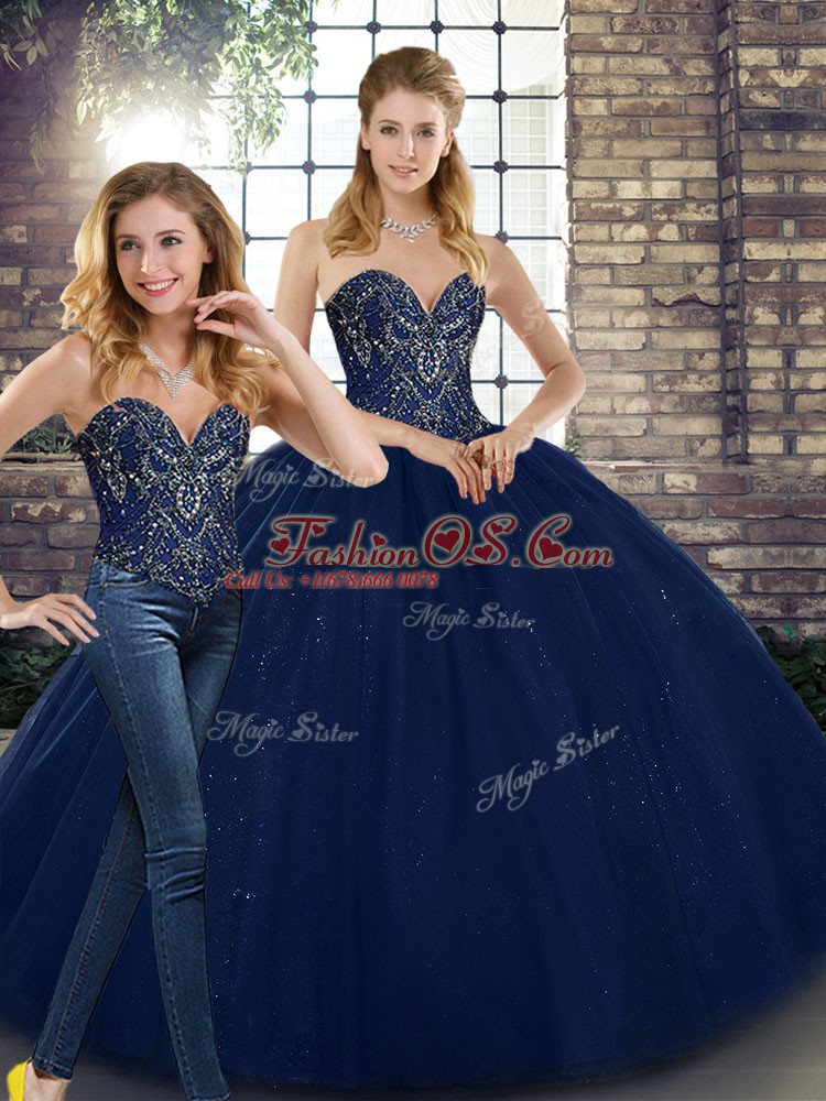 Romantic Floor Length Navy Blue Vestidos de Quinceanera Sweetheart Sleeveless Lace Up