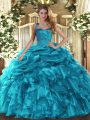 Romantic Floor Length Teal 15 Quinceanera Dress Halter Top Sleeveless Lace Up