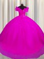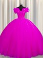 Home >  Quinceanera Dresses >  Discount Quinceanera Dresses > Romantic Fuchsia Ball Gowns Tulle Off The Shoulder Short Sleeves Ruching With Train Lace Up Sweet 16 Dresses Court Train
