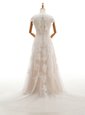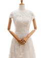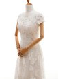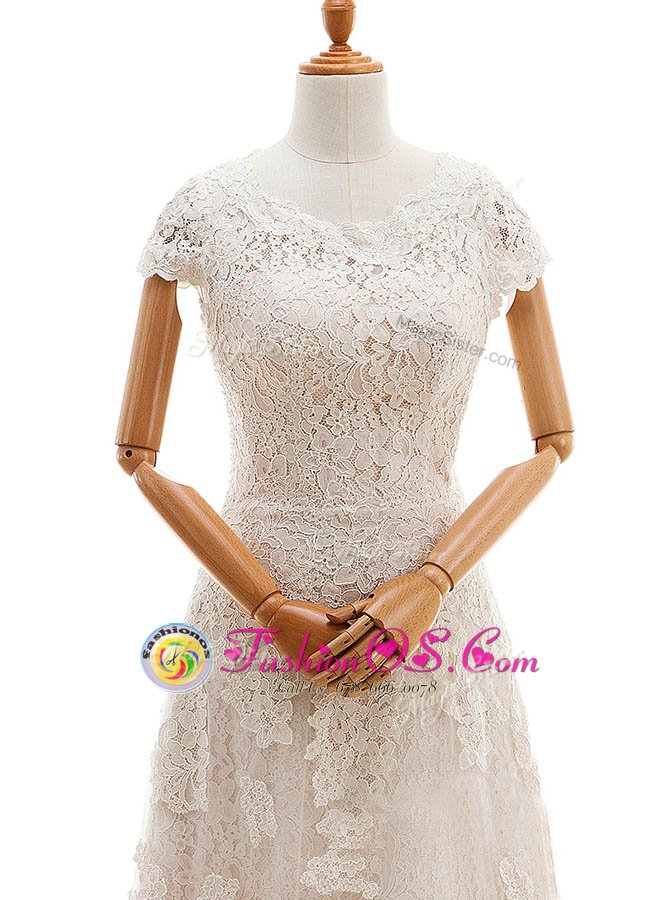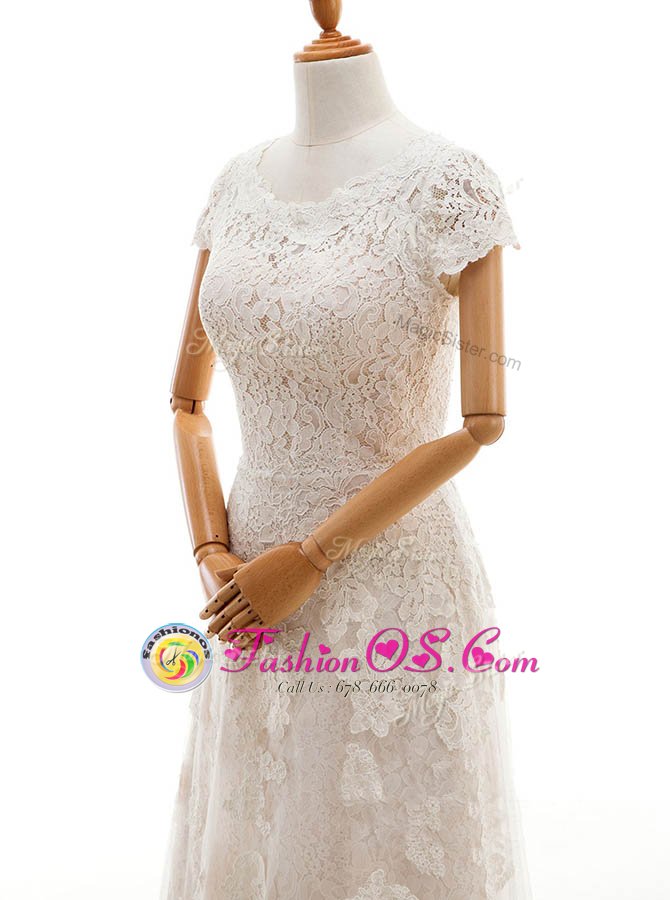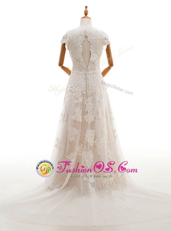 Romantic Lace Scoop Cap Sleeves Court Train Clasp Handle Appliques Wedding Dress in Champagne