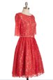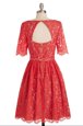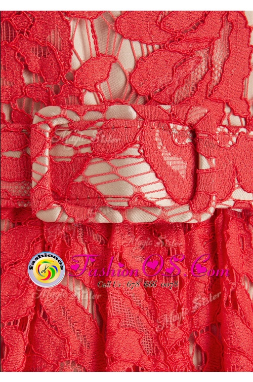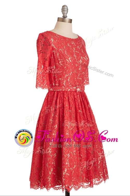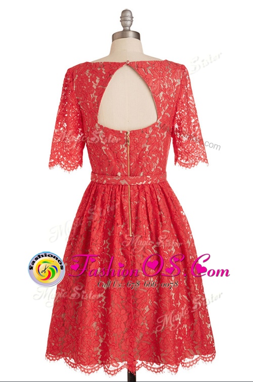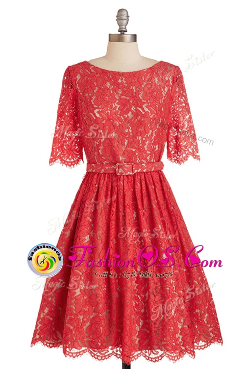 Romantic Red A-line Scoop Short Sleeves Lace Knee Length Zipper Belt