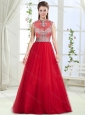 Romantic See Through Back Beaded Wine Red Evening Dress with High Neck