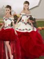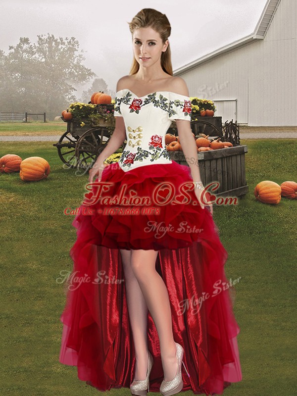 Romantic White And Red Off The Shoulder Neckline Embroidery and Ruffles 15 Quinceanera Dress Sleeveless Lace Up