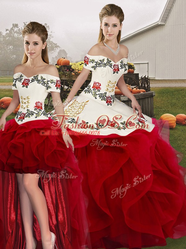 Home >  Quinceanera Dresses >  Detachable Quinceanera Skirts > Romantic White And Red Off The Shoulder Neckline Embroidery and Ruffles 15 Quinceanera Dress Sleeveless Lace Up
