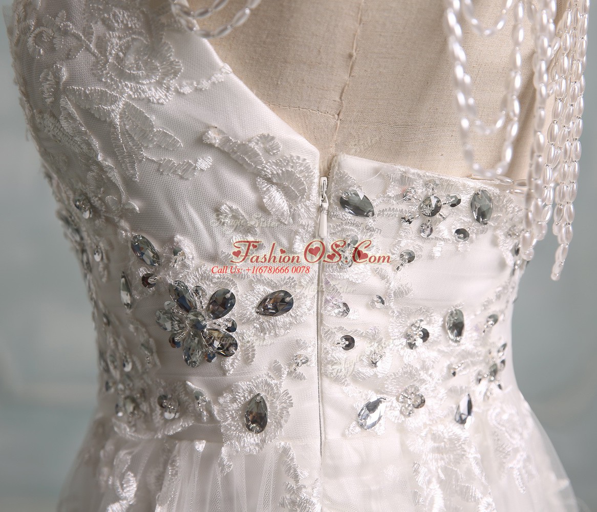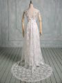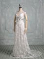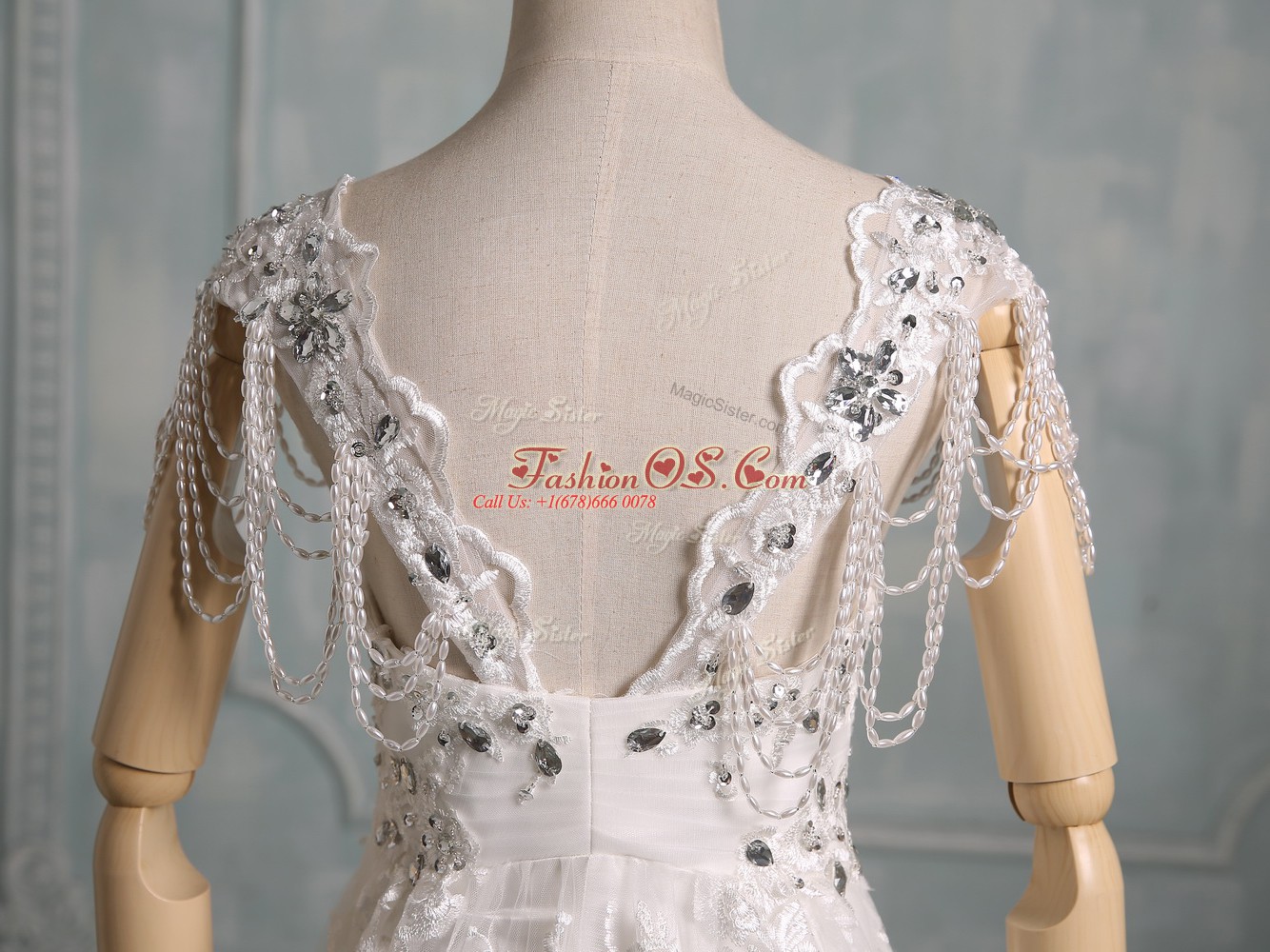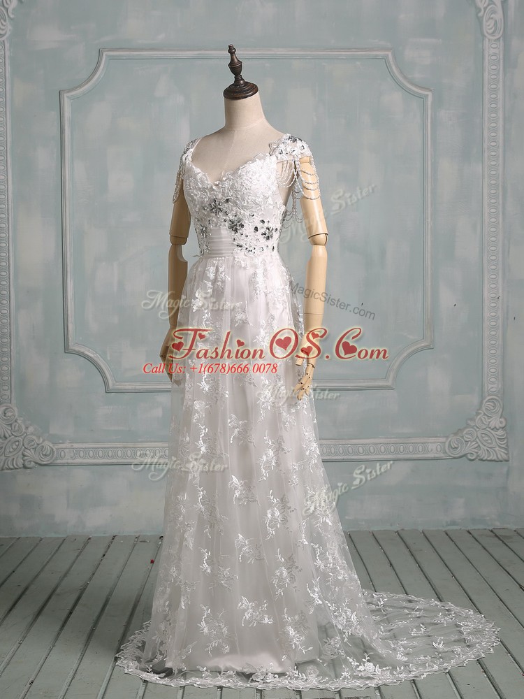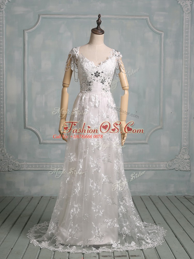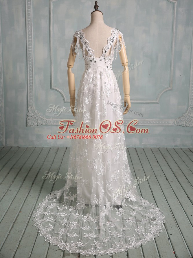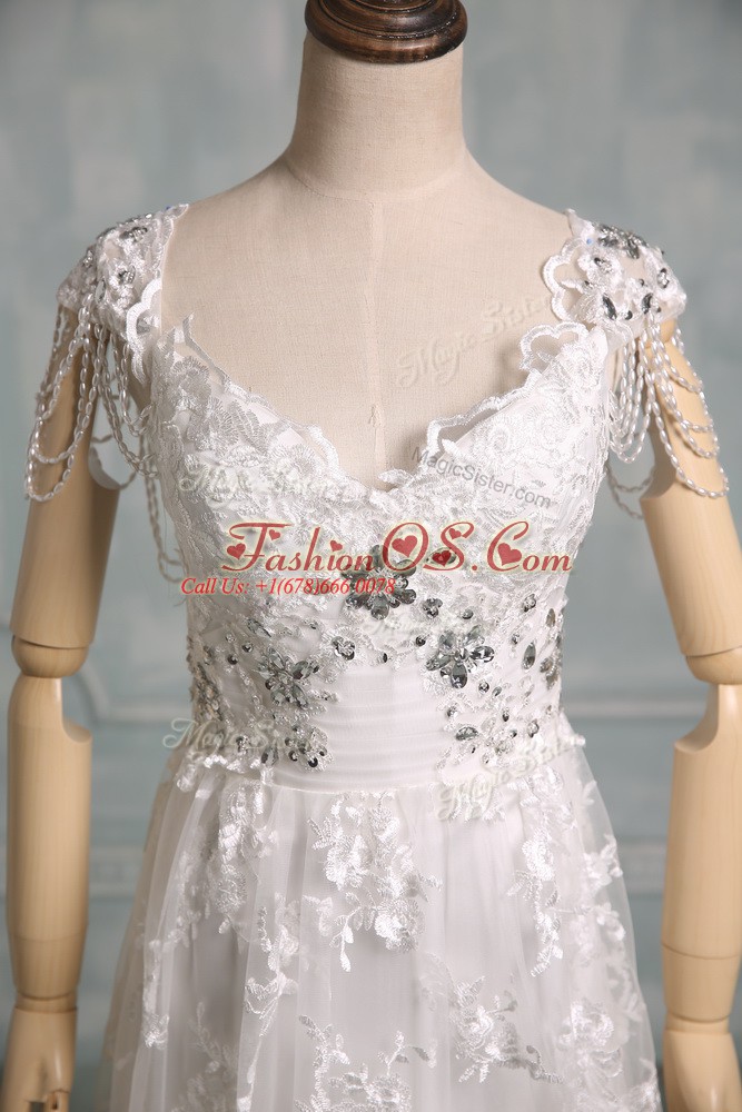 Romantic White Empire Lace V-neck Cap Sleeves Beading and Lace Side Zipper Wedding Gown Brush Train