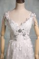 Home >  Wedding Dresses >  Wedding Dresses 2019 > Romantic White Empire Lace V-neck Cap Sleeves Beading and Lace Side Zipper Wedding Gown Brush Train