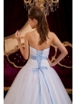 An elegant white quinceanera dress fit for any formal occasion. The sweetheart neckline gown features with a sheathy bodice decorated with appliques and light blue band on the up and under bustline. The skirt accents the appliques asymmetrically and a light tulle creating a flowy feeling. A simple yet romantic dress for any who want to be the shinning star.