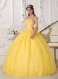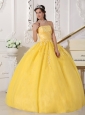 Home >  Quinceanera Dresses >  Sweet 16 Dresses > Romantic Yellow Quinceanera Dress Strapless Taffeta and Tulle Appliques Ball Gown
