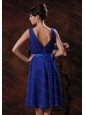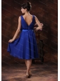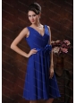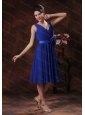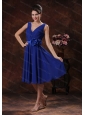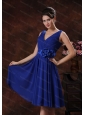 Make an entrance in this elegant and romantic v-neck bridesmaid dress. The skirt is flowy with soft chiffon to your ankle. This royal blue dress features a lovely v-neck bodice with delicate ruche covering the bust area and decorated by the handmade flower band on the waist. The zipper up back completes the look and hold the dress in places.