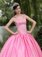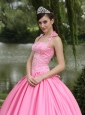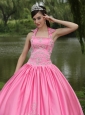 A sexy and shinning quinceanera gown features with a halter-top neck with hemming on both sides. It has a sheathy bodices with a laceup back. Intricate appliques with beadwork scattered adds the stunning feeling of the dress. The gown looks full with a petticoat in it, the same appliques scattered fully around the bottom gown, all the elements of this dress contribute to its romantic charm.