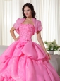 Picture-perfect elegance abounds on this utterly magnificent dress!It boasts gorgeous embroideries all through the fitted bodice. Its skirt explodes with bold pickups and oversized ruffles. Delicate rosette accents are tucked here and there for peekaboo style.The skirt sweeps boldly to the floor in a lustrous and exciting way.Everything is topped off by a matching, cap-sleeved bolero.