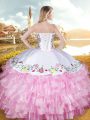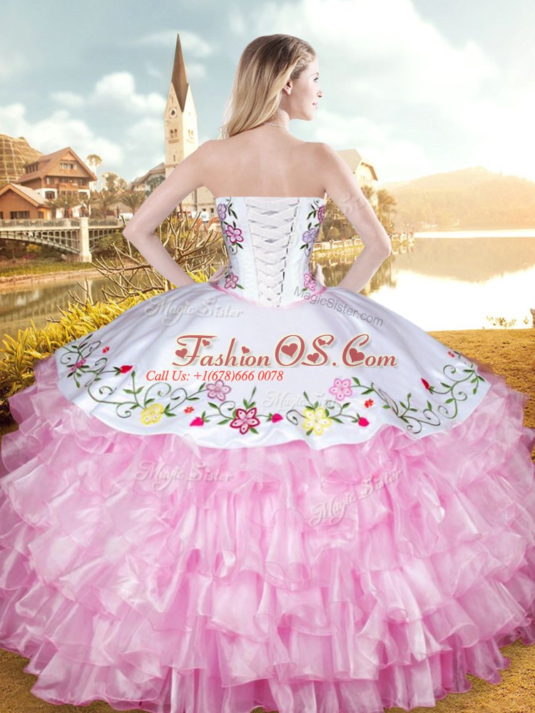 Rose Pink Ball Gowns Embroidery and Ruffled Layers Ball Gown Prom Dress Lace Up Organza and Taffeta Sleeveless Floor Length