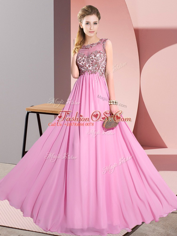 Rose Pink Sleeveless Floor Length Beading and Appliques Backless Wedding Guest Dresses