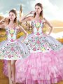 Rose Pink Three Pieces Sweetheart Sleeveless Organza and Taffeta Floor Length Lace Up Embroidery and Ruffled Layers Ball Gown Prom Dress