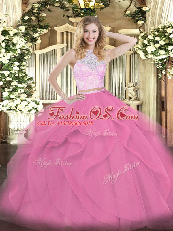 Home >  Quinceanera Dresses >  Fast Delivery Quinceanera Dresses > Rose Pink Tulle Zipper Ball Gown Prom Dress Sleeveless Floor Length Lace and Ruffles
