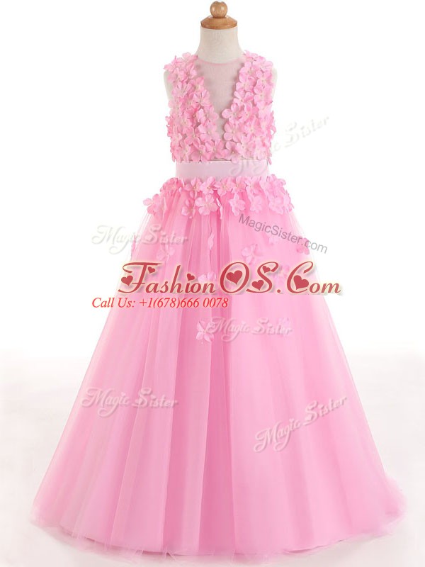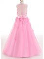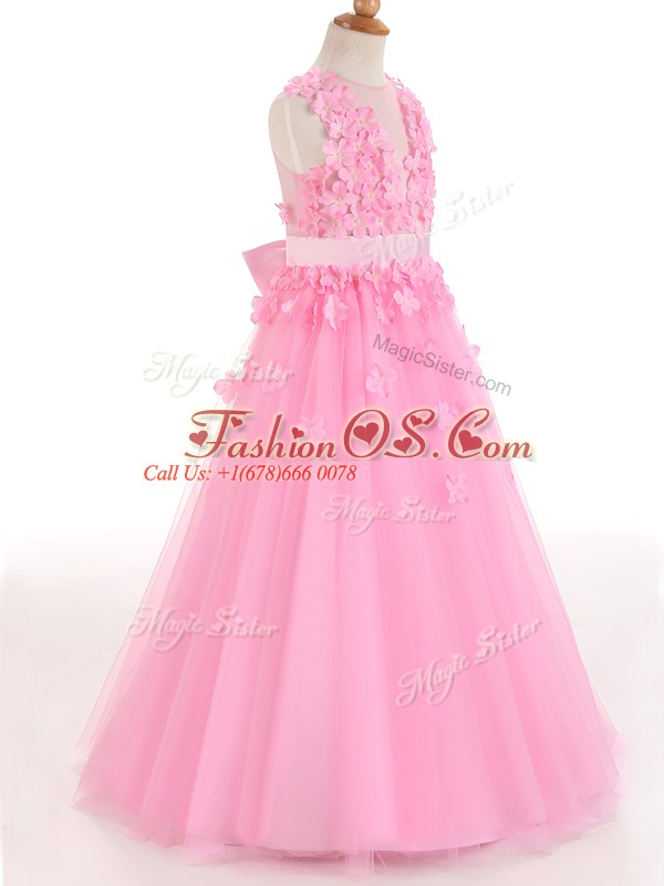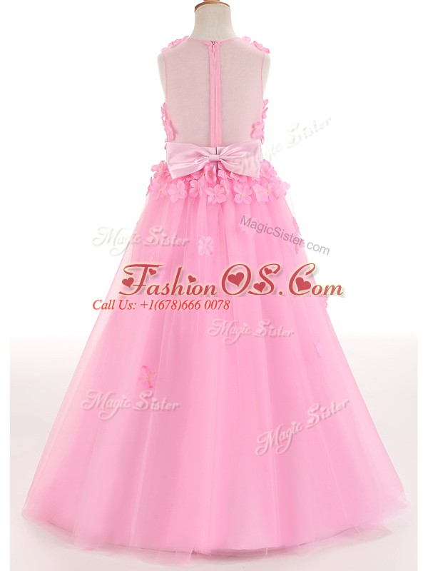 Rose Pink Tulle Zipper Scoop Sleeveless Floor Length Girls Pageant Dresses Appliques and Bowknot