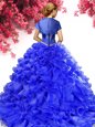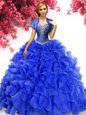 Home >  Quinceanera Dresses >  Perfect Quinceanera Dresses > Royal Blue Ball Gowns Sweetheart Sleeveless Organza With Train Sweep Train Lace Up Beading and Ruffles Sweet 16 Dresses