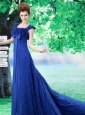 Royal Blue Flowers Decorate Prom Dress With Lace Sequare Neckline