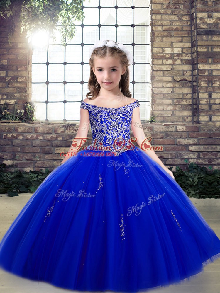 Home >  Special Occasion Dresses >  2019 Little Girl Pageant Dresses > Royal Blue Lace Up Off The Shoulder Beading and Appliques Little Girls Pageant Dress Wholesale Tulle Sleeveless