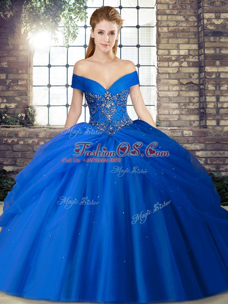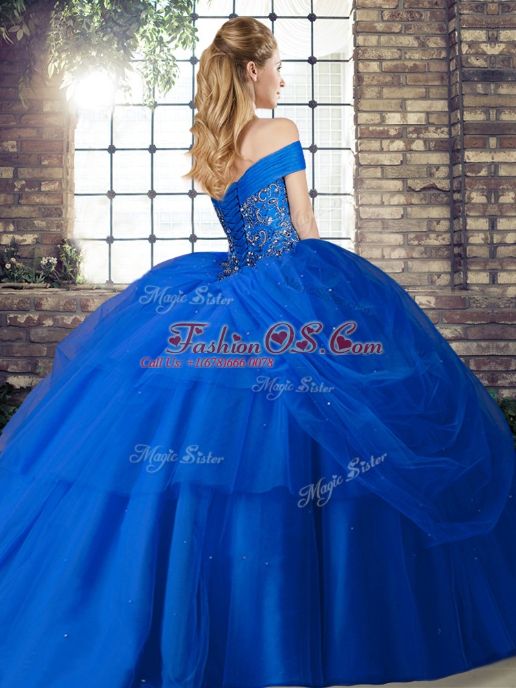 Royal Blue Off The Shoulder Lace Up Beading and Pick Ups Sweet 16 Dresses Brush Train Sleeveless