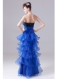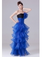 A fabulous dress for prom, homecoming or a special night out features a strapless bodice with widthways pleated accents accentuate the bust line and the waist line. The upper bust in black is adorned with a blue hand made flower for a charming look. Tiers of layers on the skirt add intrest and grace to the dress. The airy layers made from organza creat a a saasy, funning look. A wonderful dress that is sure to get you noticed. Zipper up closure finishes the look.