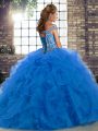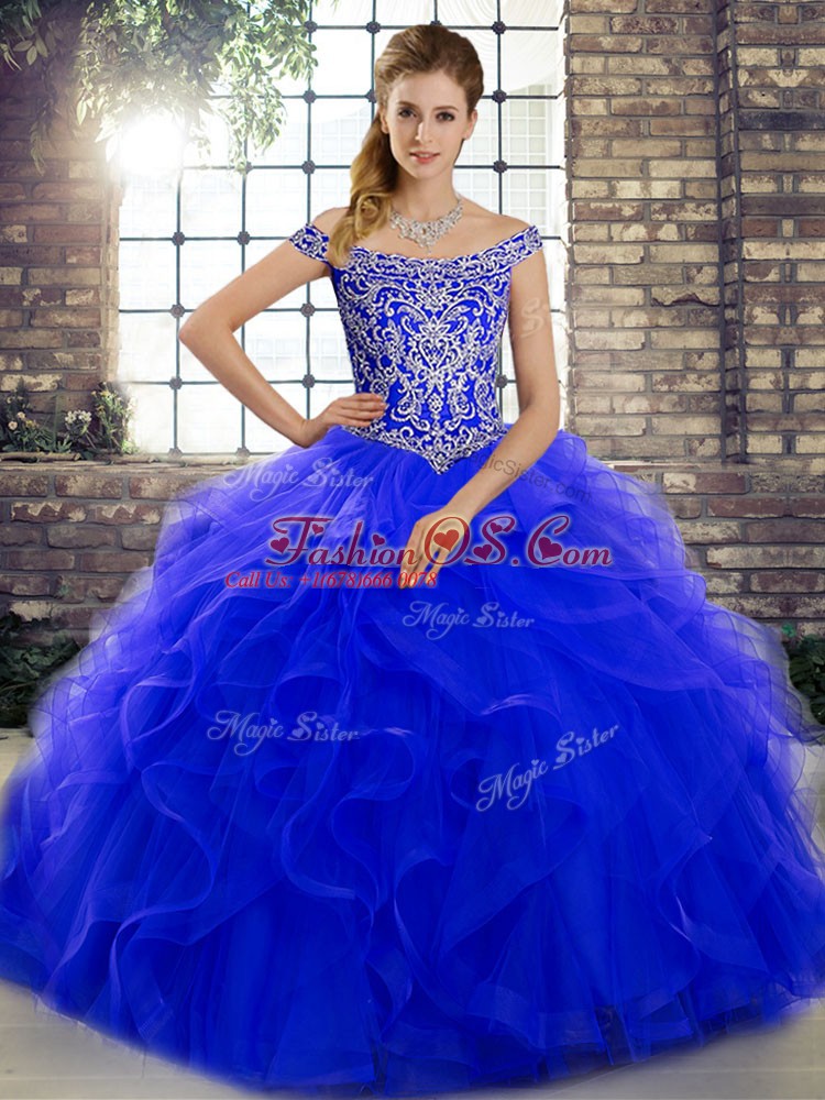 Royal Blue Sleeveless Brush Train Beading and Ruffles Sweet 16 Quinceanera Dress