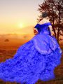Royal Blue Sleeveless Brush Train Embroidery and Ruffles Quince Ball Gowns
