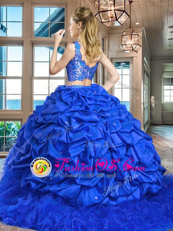 Royal Blue Taffeta and Tulle Zipper V-neck Sleeveless 15 Quinceanera Dress Brush Train Lace and Ruffles and Pick Ups