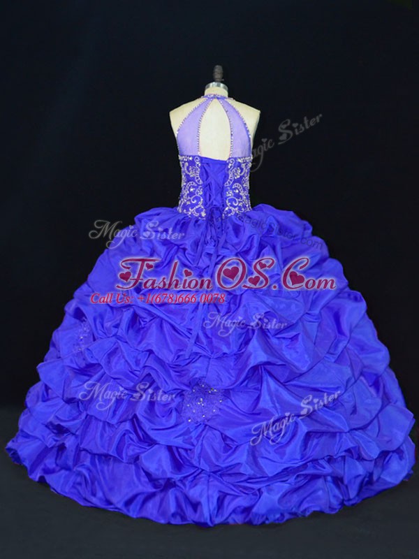 Royal Blue Taffeta Lace Up Halter Top Sleeveless Floor Length Sweet 16 Quinceanera Dress Beading and Appliques and Embroidery and Pick Ups