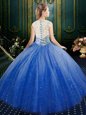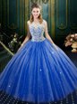 Home >  Quinceanera Dresses >  Puffy Quinceanera Dresses > Royal Blue Zipper High-neck Lace Ball Gown Prom Dress Tulle Sleeveless
