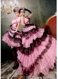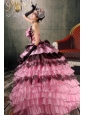 Ruffled Layers Hand Made Flowers Beaded For  Baby Pink and Black Quinceanera Dress