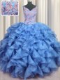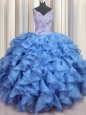 Ruffled V-neck Sleeveless Organza Quince Ball Gowns Appliques and Ruffles Lace Up