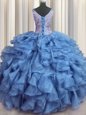 Home >  Quinceanera Dresses >  Unique Quinceanera Dresses > Ruffled V-neck Sleeveless Organza Quince Ball Gowns Appliques and Ruffles Lace Up