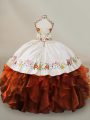 Rust Red Lace Up Halter Top Embroidery and Ruffles Ball Gown Prom Dress Organza Sleeveless