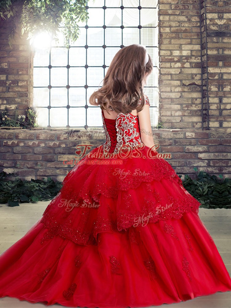 Rust Red Sleeveless Floor Length Beading and Appliques Lace Up Pageant Dress for Teens