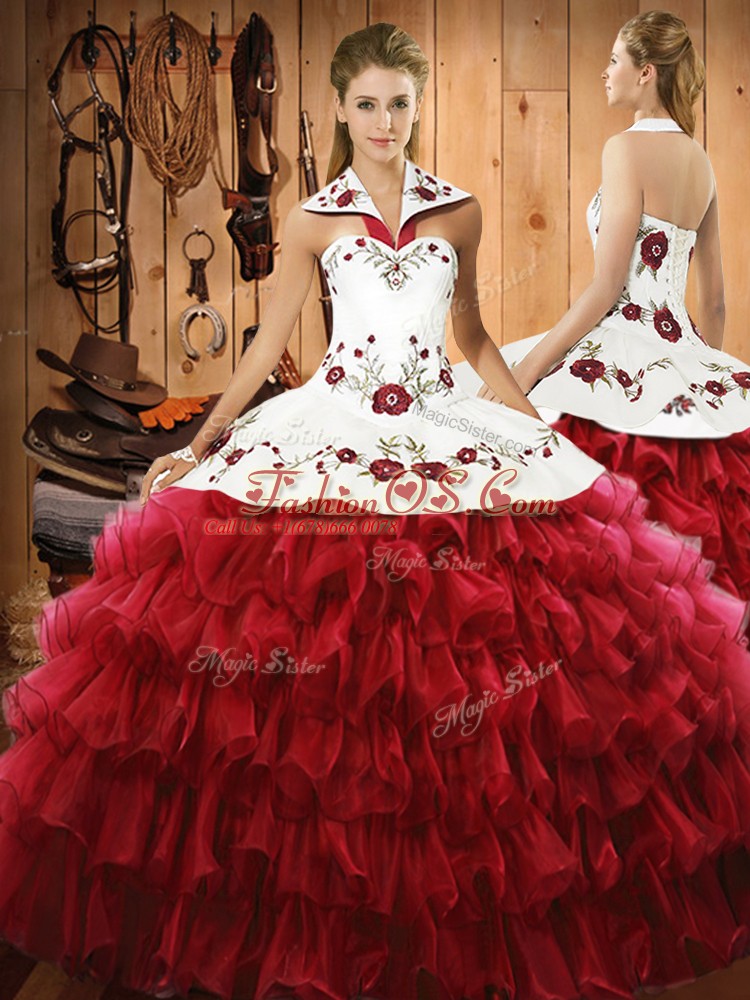 Satin and Organza Sleeveless Floor Length Quinceanera Gown and Embroidery and Ruffled Layers