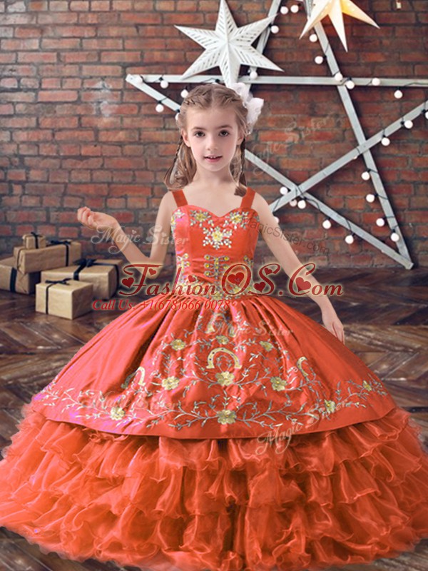 Home >  Special Occasion Dresses >  Pretty Little Girl Pageant Dresses > Satin and Organza Straps Sleeveless Lace Up Embroidery and Ruffled Layers Kids Formal Wear in Orange Red
