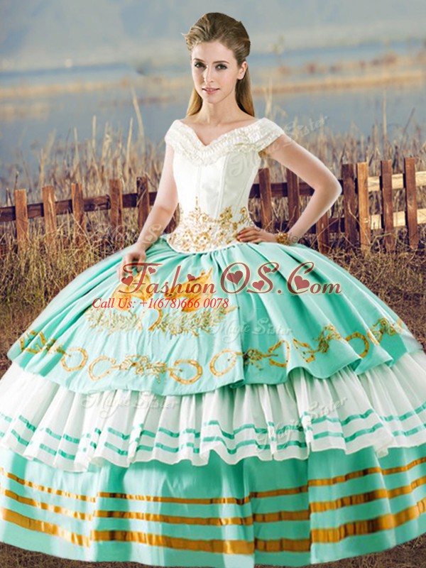Home >  Quinceanera Dresses >  Quinceanera Dresses 2019 > Satin and Organza V-neck Sleeveless Lace Up Embroidery and Ruffled Layers Sweet 16 Quinceanera Dress in Apple Green