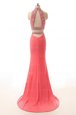 Home >  Prom Dresses >  Perfect Prom Dresses > Satin High-neck Sleeveless Brush Train Backless Beading and Appliques and Belt Prom Evening Gown in Watermelon Red