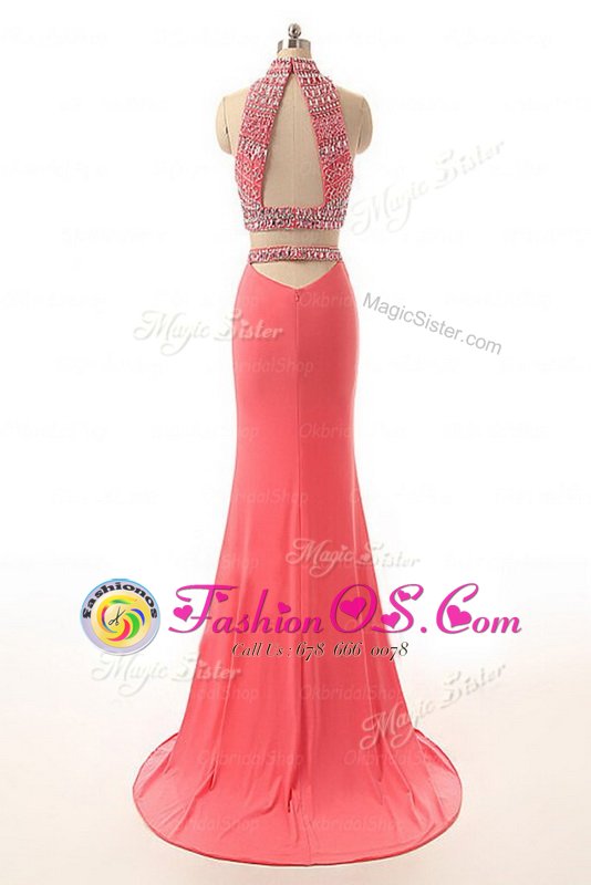 Satin High-neck Sleeveless Brush Train Backless Beading and Appliques and Belt Prom Evening Gown in Watermelon Red