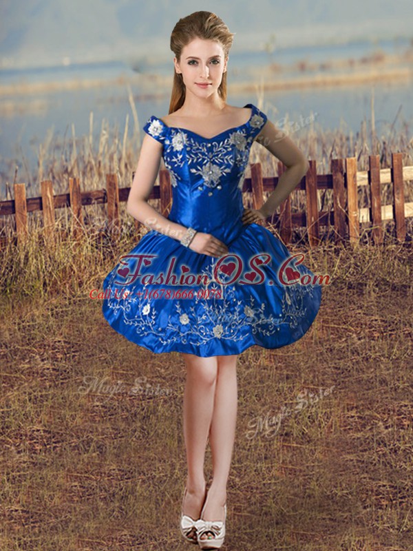 Home >  Quinceanera Dresses >  Detachable Quinceanera Skirts > Satin Off The Shoulder Sleeveless Lace Up Embroidery and Ruffled Layers Quince Ball Gowns in Royal Blue