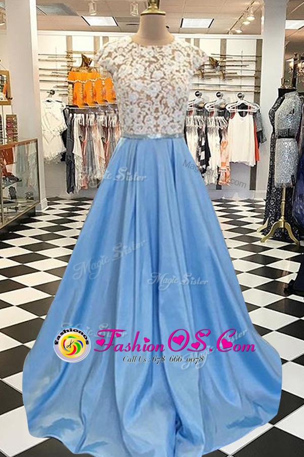 Home >  Prom Dresses >  Perfect Prom Dresses > Satin Scoop Cap Sleeves Sweep Train Backless Beading and Lace Evening Dress in Blue