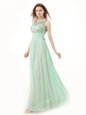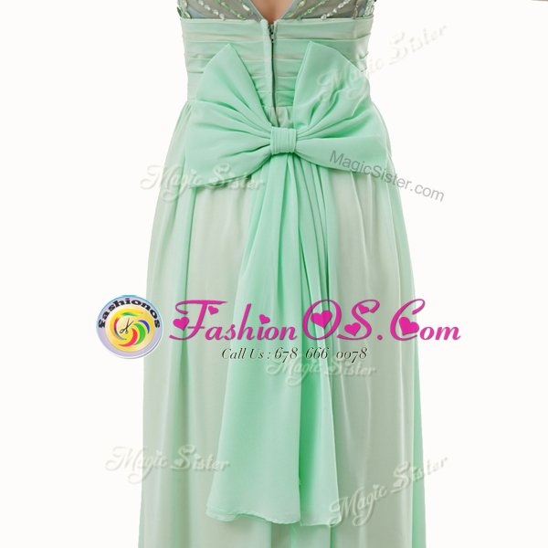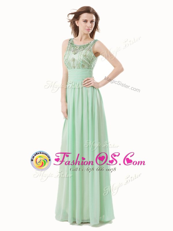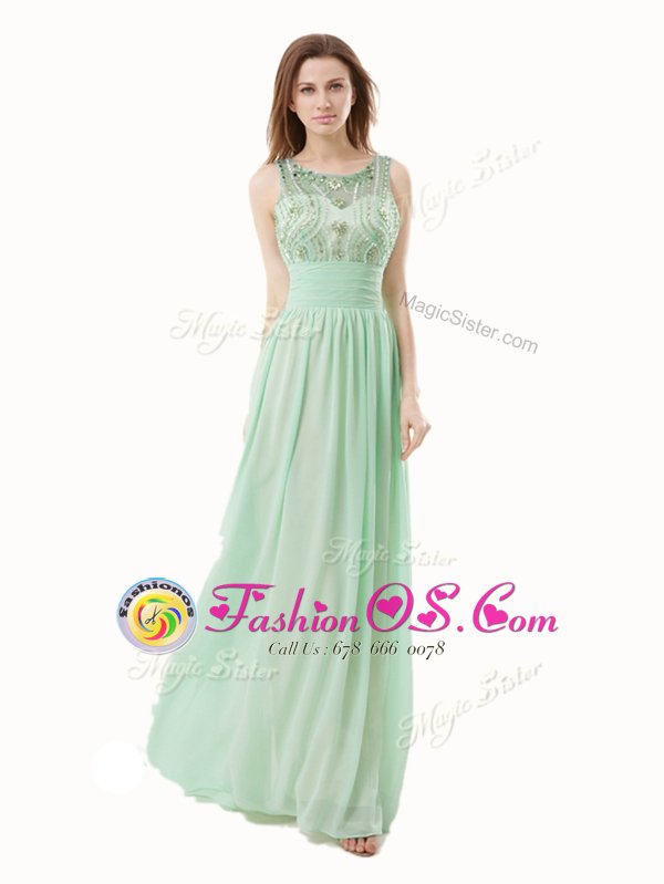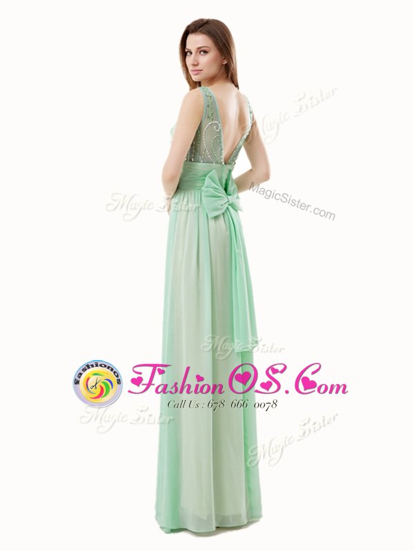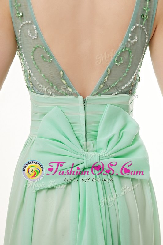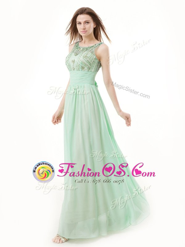 Scoop Apple Green Sleeveless Floor Length Beading and Bowknot Zipper Dress for Prom
