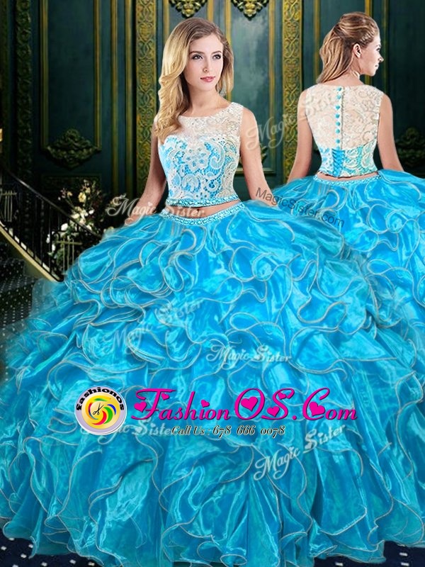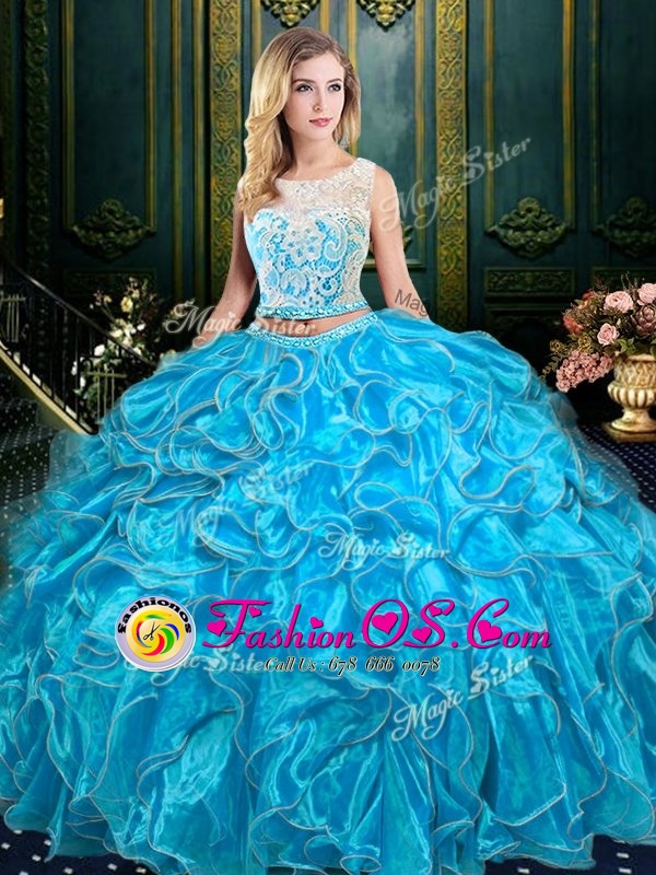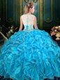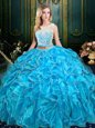 Scoop Baby Blue Sleeveless Lace and Ruffles Floor Length Quinceanera Gowns