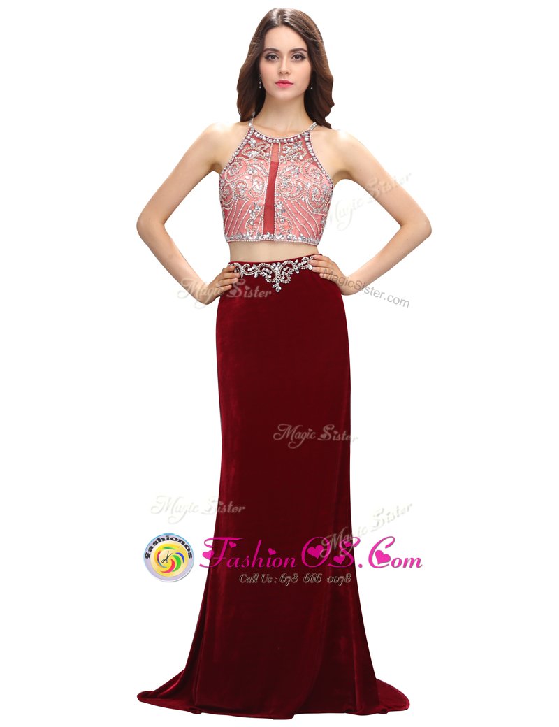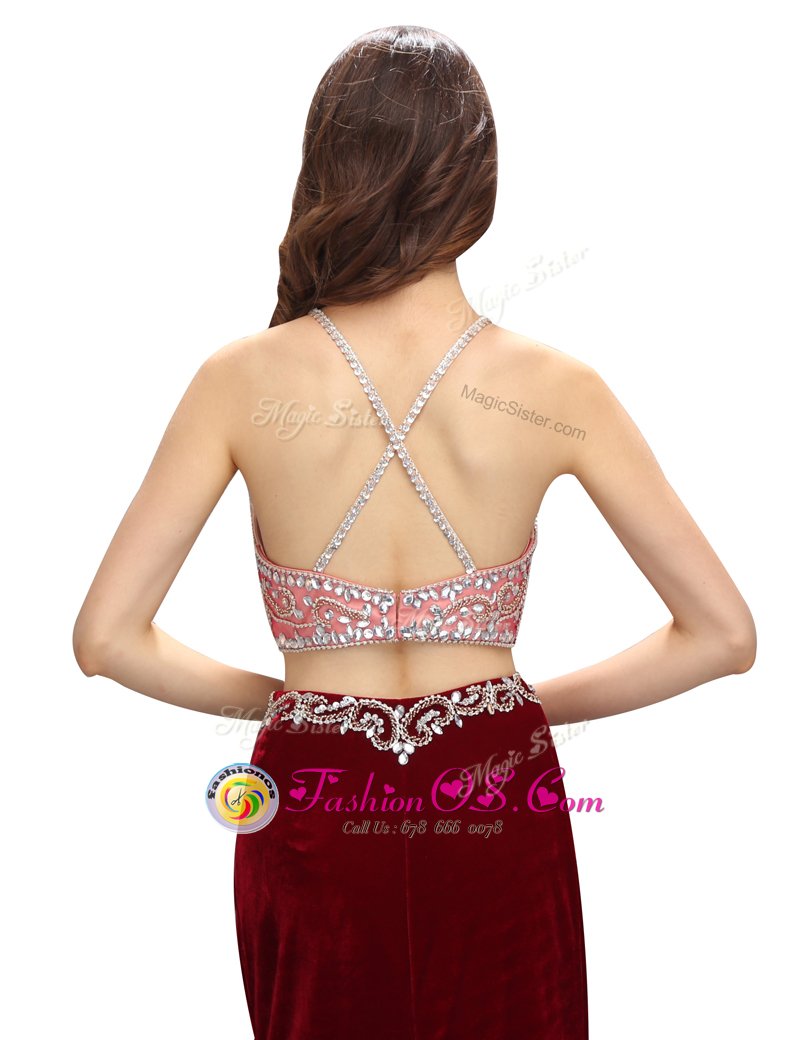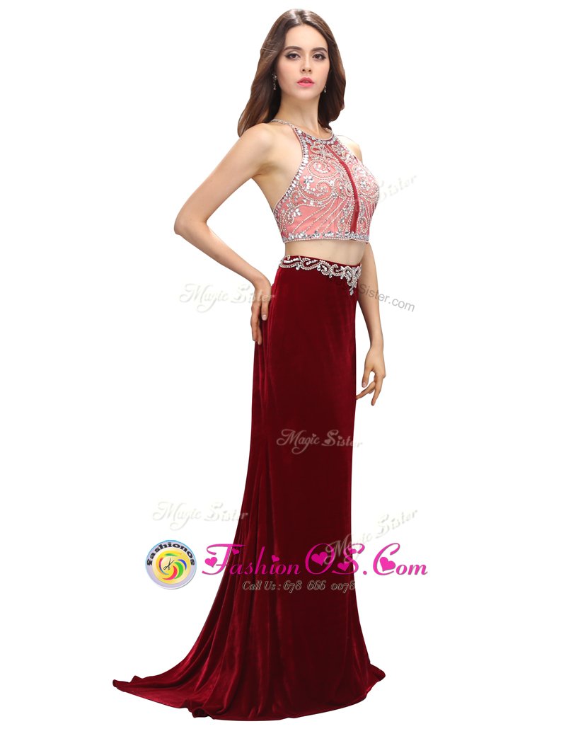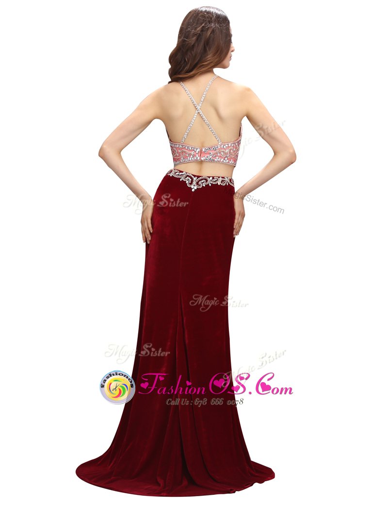 Scoop Burgundy Elastic Woven Satin Criss Cross Celebrity Style Dress Sleeveless With Train Sweep Train Beading and Appliques