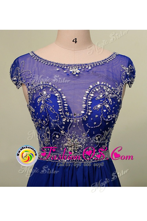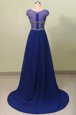 Scoop Cap Sleeves Prom Dresses With Train Beading and Appliques Blue Chiffon