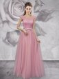 Scoop Cap Sleeves Tulle Prom Dresses Lace and Ruching and Bowknot Lace Up