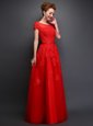 Scoop Floor Length A-line Cap Sleeves Red Prom Dress Lace Up
